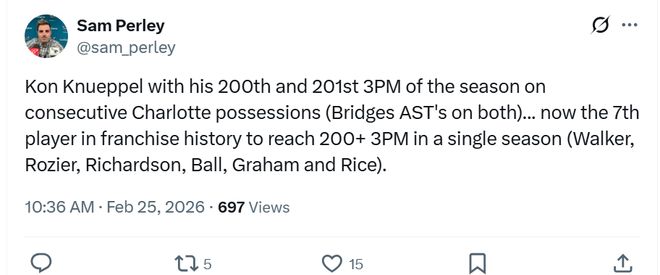纪录一:克努佩尔本赛季已经命中201记三分,成为黄蜂队史第7位单赛季命中200记三分的球员,前6人分别是肯巴沃克、罗齐尔、理查德森、鲍尔、格拉汉姆和格伦-莱斯,克努佩尔仅花费58场比赛队史所用场次最少。